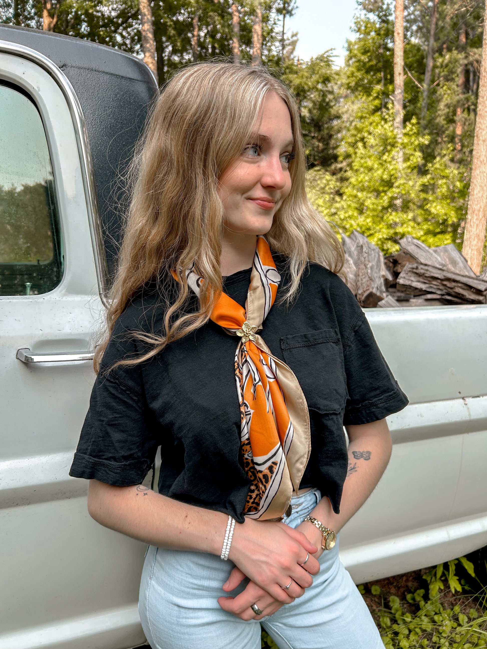 Add a touch of wildness to your style with the Palomino Wild Rag! This luxurious scarf features a striking horse outline and unique prints of leopard and polka dots. Made with a silky material, it adds a touch of elegance to any outfit. Make a statement and stand out from the crowd with this must-have accessory.